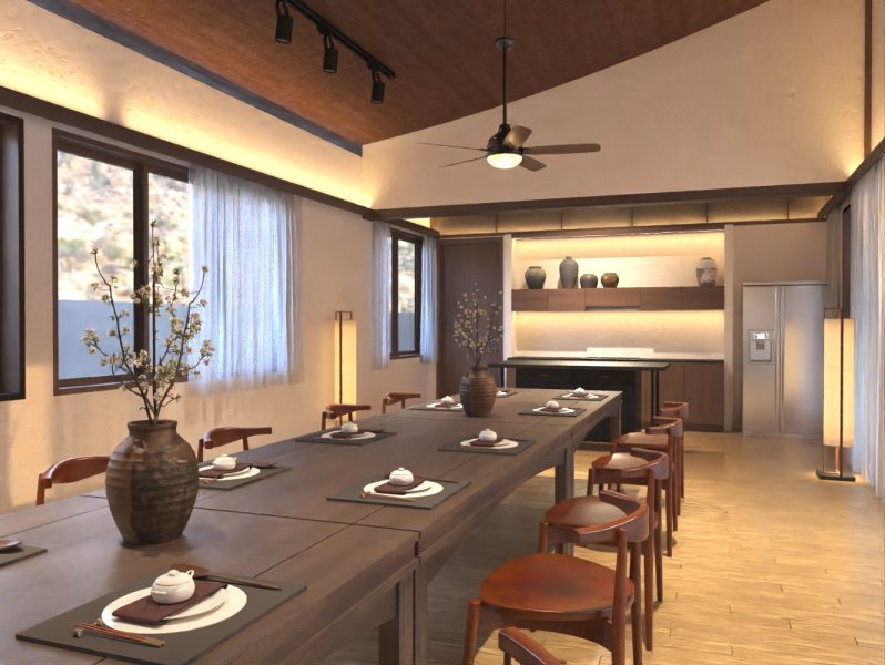 Bố cục công trình lấy cảm hứng từ mô hình Tứ Hợp Viện truyền thống của Trung Quốc, được chúng tôi lựa chọn xuất phát từ mong muốn và phong cách yêu thích của gia chủ. Các khối nhà được tổ chức bao quanh sân trong lớn, tạo nên một hệ không gian tụ họp thoáng đãng nhưng hướng nội, và kín đáo như yêu cầu. Cấu trúc nhiều lớp lang, từ cổng, tiền sảnh, sảnh đệm đến không gian thờ chính và khu ở, giúp công trình duy trì sự riêng tư, đồng thời cho phép các hoạt động sinh hoạt và nghi lễ diễn ra song song mà không chồng lấn. Ân Từ Đường vì thế được xem như là một nơi để trở về, lặng lẽ gìn giữ mối quan hệ giữa con người với cội nguồn, giữa đời sống thường nhật và không gian thờ tự – nơi việc sống và việc nhớ ơn diễn ra trong cùng một mái nhà.