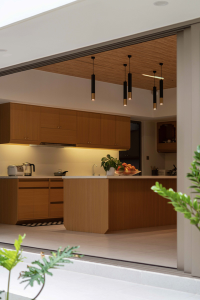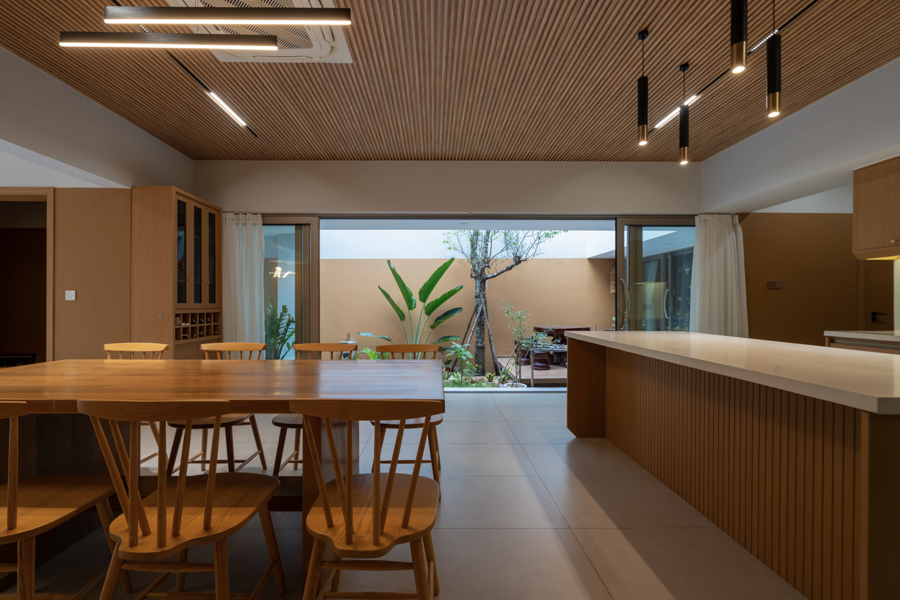 Recalling our first meeting with the homeowner, whose demeanor was solemn and who valued discretion and a disciplined way of life, we gained a clearer vision for the project. The house needed to embody stillness, restraint, and elegance: understated, yet strong and resilient. From this, Volumetric Composition was chosen as the guiding language – an essential means of shaping the house’s solids and voids, its enclosed and open spaces. Rectangular blocks and walls are stacked along horizontal and vertical axes. This organization ensures order and stability while allowing interwoven openings that create flexible connections between inside and outside, between mass and emptiness.