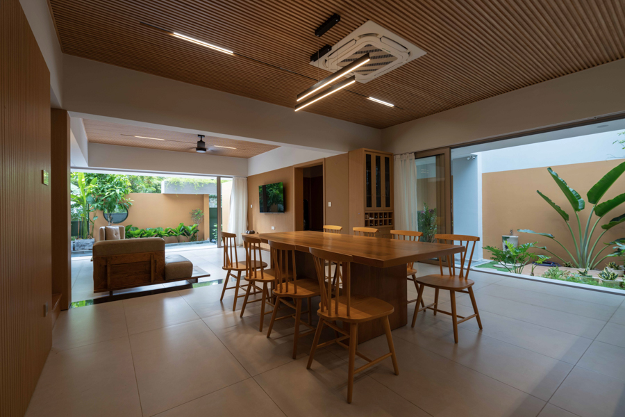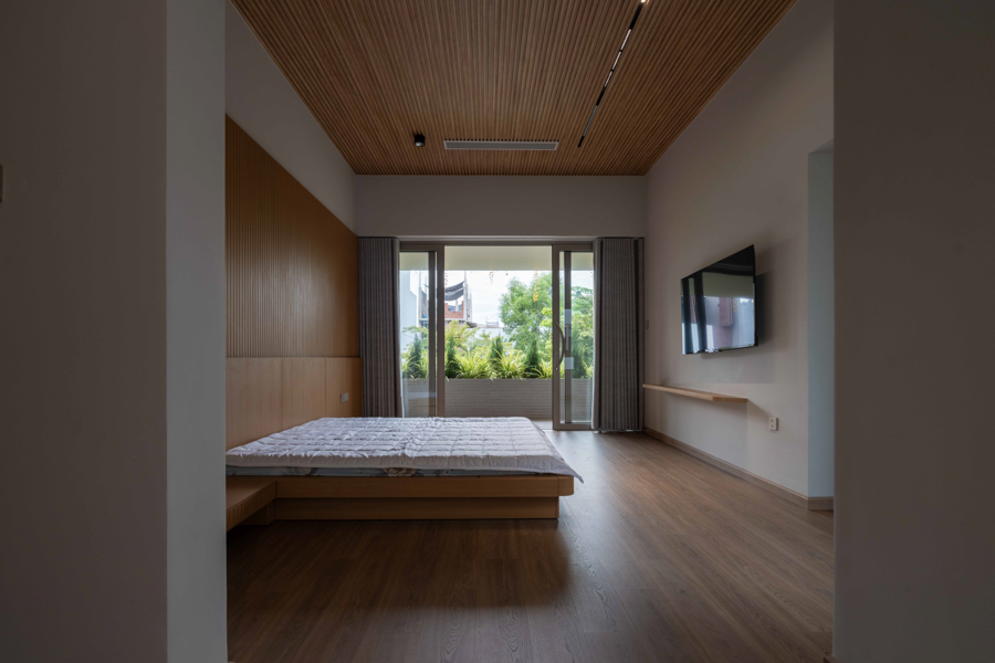 Nature is the breath of Hòa Xuân Villa. A large garden was placed beneath the central skylight, complemented by smaller planters scattered across balconies, the roof, and the entrance, so that greenery is present everywhere. Plants, light, wind, and the scent of soil bring freshness and serenity, a reward for the passage of time and the tranquility the homeowner values.