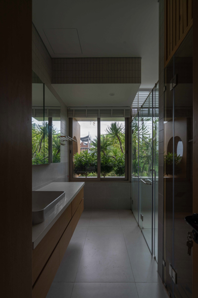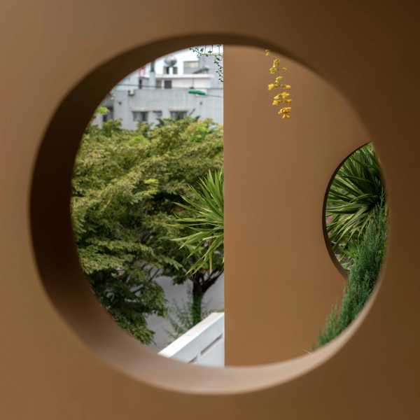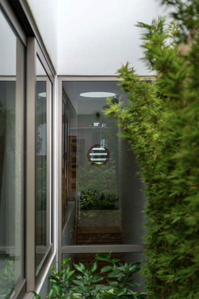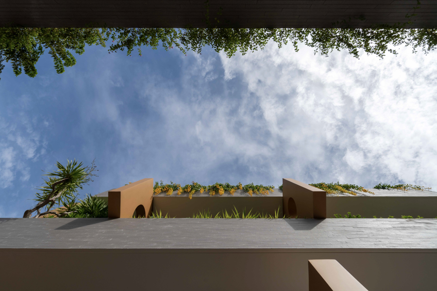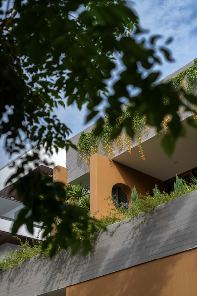Thiên nhiên là hơi thở của Hòa Xuân Villa. Chúng tôi thiết kế một vườn lớn ở giếng trời giữa nhà, và vườn nhỏ là các bồn cây rải rác trên ban công, mái, cổng vào, để mọi nơi đều có một mảng xanh. Cây cỏ, ánh sáng, gió và mùi đất tạo nên sự tươi mới và thư thái, là phần thưởng cho tuổi tác và sự yên tĩnh mà gia chủ trân trọng.